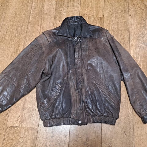 Paksua nahkaa, painava vintage nahkatakki, kauluksessa ajan patinaa/kulumaa.