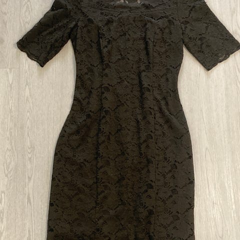 Paljeteilla ja helmillä kirjailtu mekko. Hihat pitsiä, selässä sama pitsi mutta mekko-osa on vuoritettu.