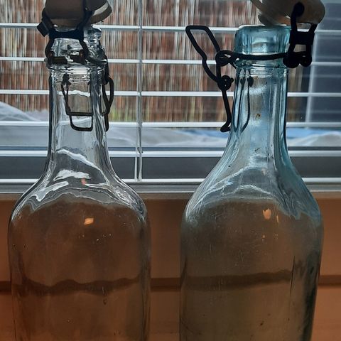 Seitsemän vanhaa kaunista lasipulloa, osassa patenttikorkki, joissa leima. Puhdistus jää ostajalle :)