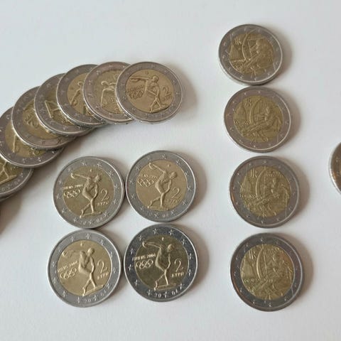 37kpl 2€ kolikoita. Kierrossa olleita. Mukana myös risuraha ja Ateenan 2004 olympialaiset. Lisäksi Vatikaanin ja Monacon 50sent ja Maltan 20sent kolikot.