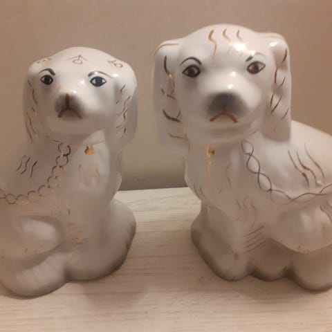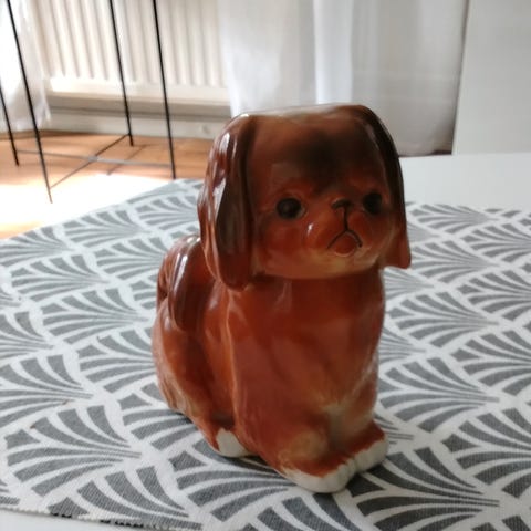 Vanha saksanpaimenkoira-patsas jonka pituus on n. 28 cm ja korkeus n. 17 cm, kipsiä. Toista korvaa on ehkä korjattu. Hinta 45 e, vain nouto.