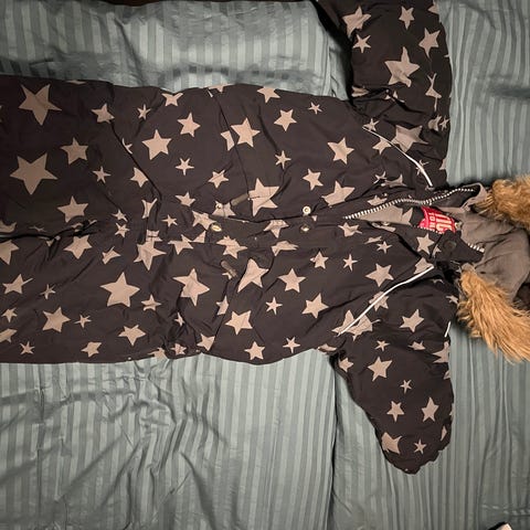 Ticket to Heaven -merkkinen tähtikuvioinen toppahaalari. Paljon käytetty ja käyttö näkyy, passeli rymyhaalariksi ja lämmittämään kuivalle kelille.