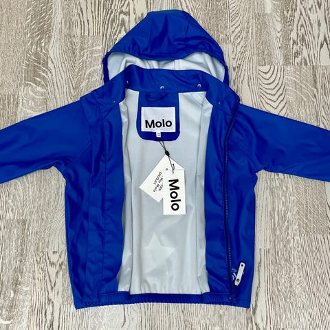 Tummansininen sadetakki, irrotettava huppu pehmällä vuorella. Nepparitaskut.