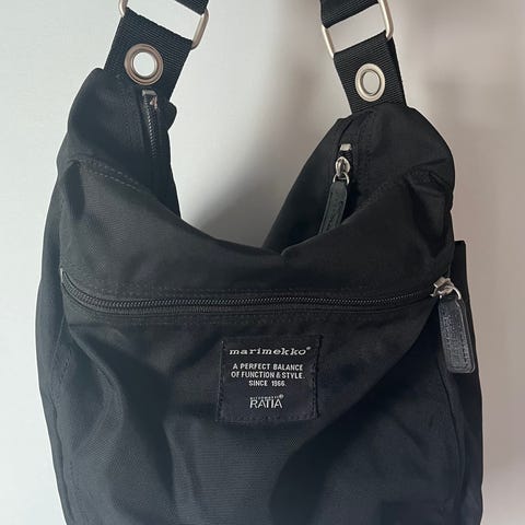Tummansininen Marimekko Pal-olkalaukku, hyvä kunto, nouto Espoo Mankkaa, lähetettäessä lisätään postituskulut, MMM