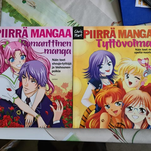 Myydään settinä Piirretään mangaa; koululaiselämää, manga keittokirja (alusta jokunen sivu irtonaisena kansien välissä), Meikkikeiju ja Fruit basket manga-kirjat. 15€