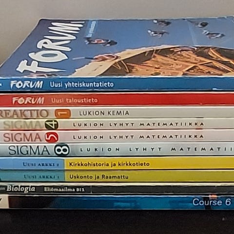 Myydään käytetyt lukiokirjat. Suurin osa on hyvässä kunnossa, mutta matikan kirjoissa on enemmän kulumajälkiä. Saattaa olla joissakin vähän merkintöjä.