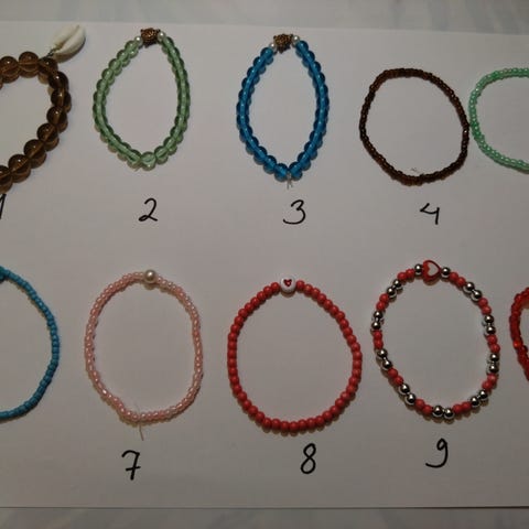 Itsetehtyjä käsikoruja, lasten koko.