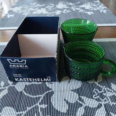 Myydään Kastehelmi kermakko ja sokerikko.Ehyet ja rikattomat.Sokerikko mitat 8,5x5,2cm.Kermakko mitat 7x5,2cm.Yhteis hinta 18eur.Nouto/Postitus.