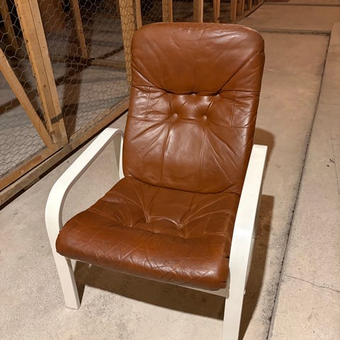 Ylimääräinen nojatuoli jossa kallistuksen säädöt ja pintamateriaali "nahka" , myös käsinojat mukana kiinnitysruuvit puuttuvat . Ollut pelituolina . Tuolissa käytön jälkiä .