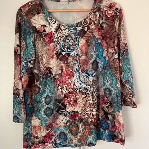 Siistikuntoinen, vihreä/musta pusero, jossa strasseja etuosassa.