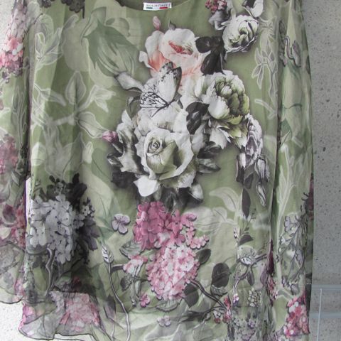 Uudenveroinen, vaaleansininen kukkakuvioinen pusero/paita. Kuviointi etu - ja takaosassa sama.