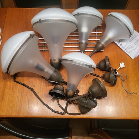 kuvien mukaisia messinkisiä valaisimia: 2kpl neljähaaraisia ja 4kpl kolmehaaraisia, 2kpl yksikupuisia, sekä yksi kpl kaksi kupuinen seinämalli.Klaus Mihailik