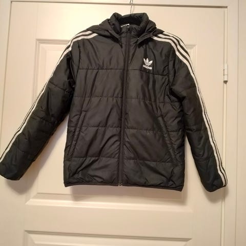 Harmaa Adidas toppatakki koko 152. Ehjä ja hyväkuntoinen muuten, mutta etupuolella tahra (näkyy kuvassa) ja pesu jää ostajalle. En ole kokeillut jos lähtisi pesussa.