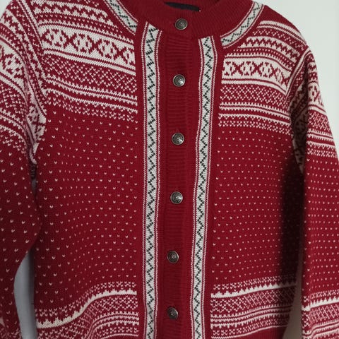 Käsinkudottu kaunis kirjoneuletakki koko M, pääväri vaaleanpunainen. Villalankaa, kuvioina mm. joutsenia ja purjeveneitä.