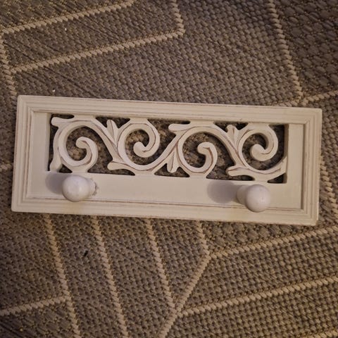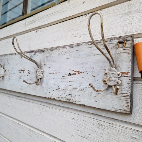Puinen, nätti naulakko. Leveys 32.7cm ja korkeus 21.5cm. 4 nuppia. Osa nupeista on melko huonosti liimattuja tai irtoo helpolla. Saa korjattua mutta nyt en pysty sitä itse toteuttamaan.