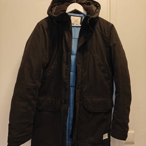 Laivaston takkia tyylittelevä Jack & Jones talvitakki. Hartialev. 58 cm, ympärys 142 cm. Pituus 77 cm. Materiaali 50% villaa 50%polyesteriä. Vuorikangas takaa kevyesti topattua polyesteriä, edessä puuvillaa. Hihojen vuorikangas polyesteriä Sivutaskut ja povitasku.