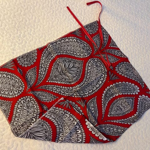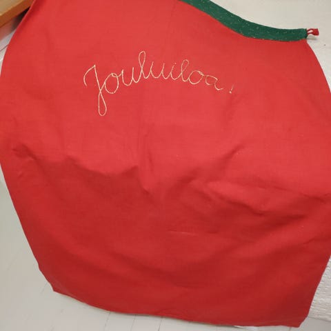 Puuvillainen, iso pussi joululahjoille. Toinen puoli yksivärinen joulunpunainen, toisella puolella kullanvärisiä, epäsymmetrisiä tähtiä. Kultaväriä on roiskahtanut parissa kohdassa myös tähden viereen, muuten kunto on erinomainen. Kiinnitys punaisilla silkkinauhoilla. Painoa pussukalla on noin 300 gr.