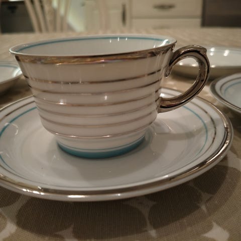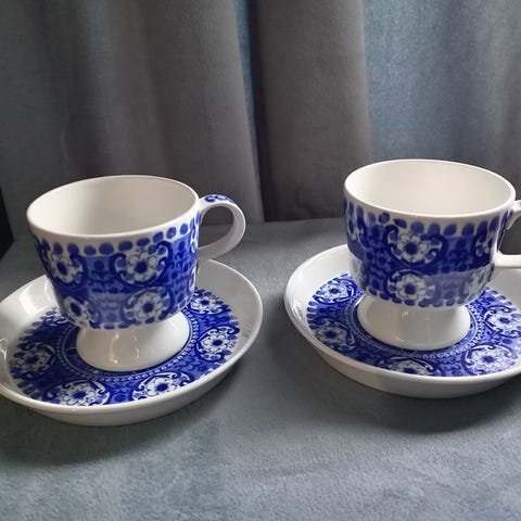 Myydään erinomaisessa kunnossa olevat Greta-Lisa Jäderholm-Snellmanin suunnittelemat kahvikupit lautasineen (aluslautanen ja pullalautanen). Valmistettu vuosina 1933-1944. Kuuden sarjasta yksi kuppi puuttuu, eli myyn viiden sarjaa ja kuudennen lautaset saat maksutta mukaan.