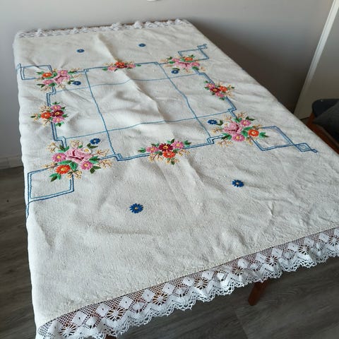 Käsityönä valmistettu kirjottu, reikäommelkantattu kaitaliina on pellavaa, kooltaan 70 x 38 cm. Liina on vanha, mutta hyväkuntoinen, karjalainen malli