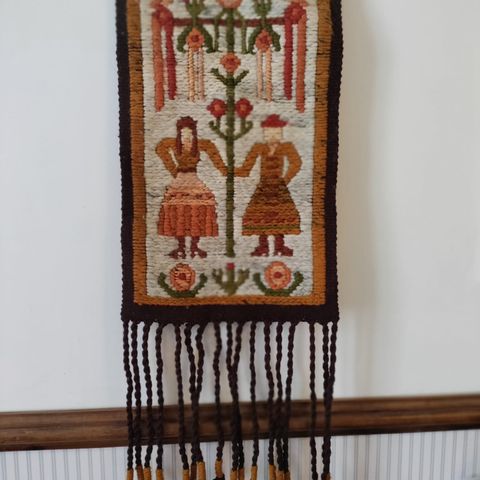 Seinätekstiili huovuttamalla villasta, nurja puoli puuvillakangasta. Ripustus puu rimalla.