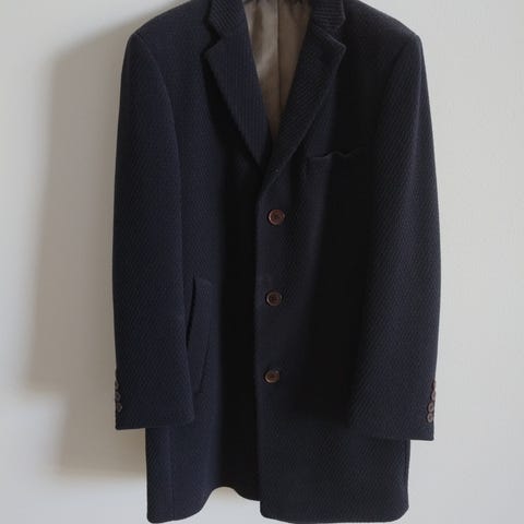 Myydään Oscar Jacobson Wool and Cashmere miesten tummansininen pitkä takki.