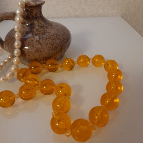 Huovutettu kaulakoru, pituus 65 cm. Kiinnityksen avulla nauhan pituutta voi säädellä. Pompulat ruskeita, mustia, oransseja ja ne ovat halkaisijaltaan n 3 cm.