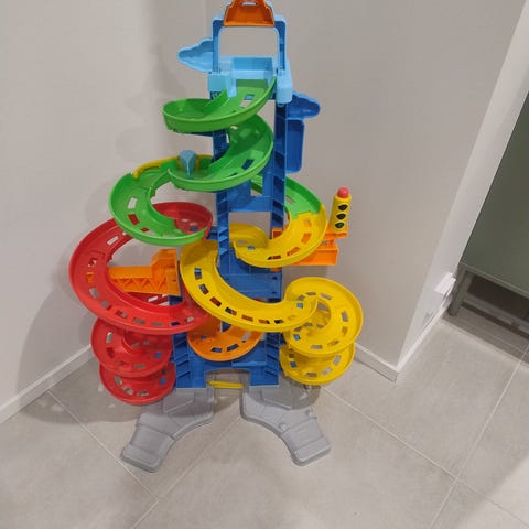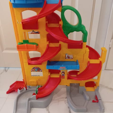 FisherPrice autorata musiikilla, valoilla ja autoäänillä. Oranssi osa pyörii ja liu'uttaa hauskasti sopivanlaiset (kevyet) autot maaliviivan yli.