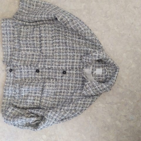 H&M musta-valkoinen buklee-/tweedtakki/jakku, lyhyt malli, koko XL. Pidetty kerran, kunnossa ei siis moitetta. Napinläpinapit.