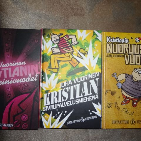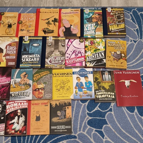 Juha Vuorisen kirjat. Linkki https://fi.wikipedia.org/wiki/Juha_Vuorinen Teokset v.2000-2014 puuttuu vuorisen raksapäiväkirja. Juoppohullun päiväkirja -sarja. Kristian sarja. DikDek-sarja puuttuu Puerto Anus. Kaikki kerralla.
