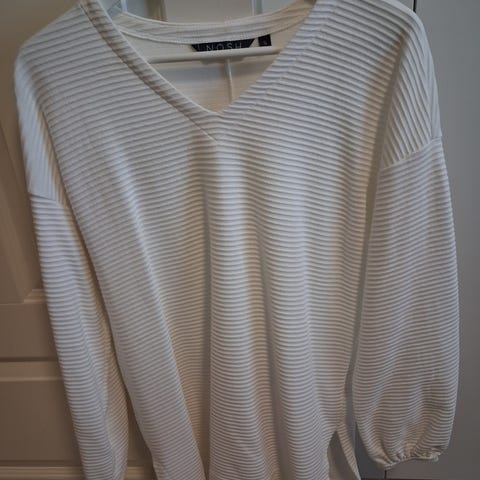 NOSH valko-musta raitapusero. Kokomerkintä tässä XS, mutta vastaa S-M kokoa. Tosi väljänmallinen, joustava.100 % luomupuuvillaa , vähän paksumpaa trikoota. Sivuilla helmassa halkiot.