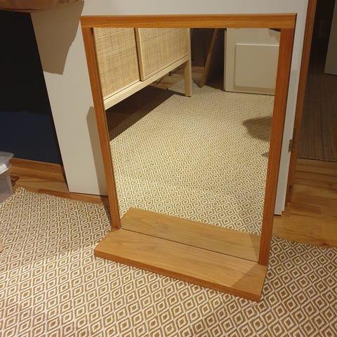 Vintage Seinä Peili, jossa lamppu sivussa(pieni kantainen), ruskeaa umpi puuta, tekijän leimat takana( toisessa kuvassa), seinä kiinnitys, koko leveys 38cm, korkeus 108.5cm, syvyys n.2cm, ehjä.