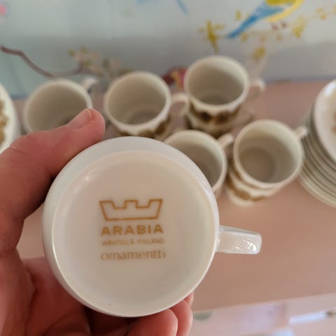 Arabian Ornamentti astiat: 2 x kahvikuppi, lautanen ja pullalautanen sekä kermakko ja sokerikko. Pientä kulumaa.