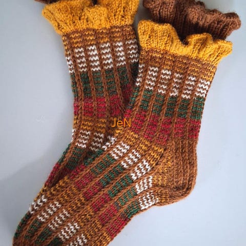 Myyn 7-veljestä langasta neulotut sukat. Terän pituus n 25 cm ja leveys 11,5 cm . Hinta25€ Pesu 40ast. Lanka 75% villa ja 25% polyamidi. Hintaan sisältyy postikulut.