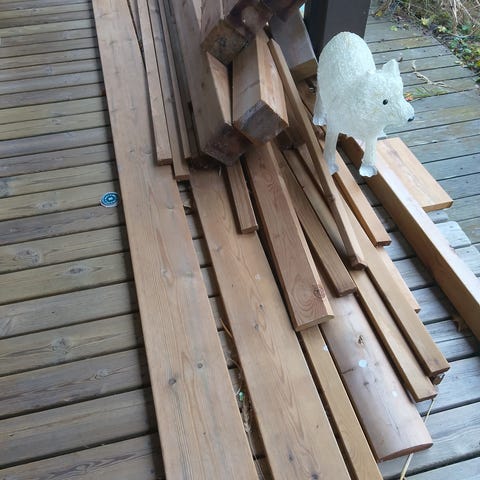 Puuvalmista umpitammista lattialistaa. Pituudet 2,4 m ja 2,9 m. Jäljellä noin 70 metriä. H. 5 e / metri.