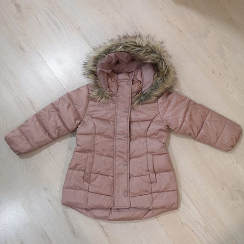 Toppatakki koko 110cm. Sivutaskut ja rinyatasku. Neppareilla irrotettava huppu. Heijastin selkäpuolella. Kiristustarrat hihoissa. Lämmin fleece vuori ja välissä vielä joku lämpökamgas. Ei kuitenkaan ihan äärimmäisen paksu, eli 30 asteen pakkasilla.
