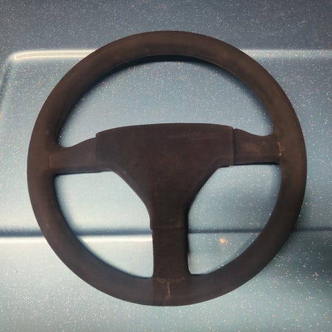 Hyväkuntoinen Luisi ratti. Ratissa on Luisin vanhan mallinen kiinnititysjako keskiöön. Ratissa on kiinni Motoral-keskiö, josta en muista mihin sopii. Mukaan uusi käyttämätön keskiö Volvo 343 -malliin ja uusi töötin nappi Toyotan logolla mutta siihen on helppo laittaa jonkun toisen merkin tarra.