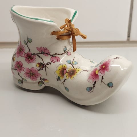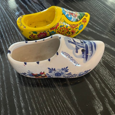 Made in Holland, käsinmaalattu, posliinikenkä, koriste, malja, ripustettava koriste, tuhkakuppi, koko 14 x 6,5 x 6cm, sininen ja valkoinen, paino 130g, kunto erinomainen