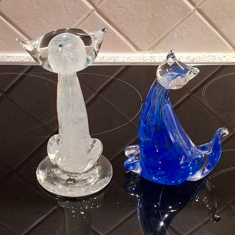 korkeus 13,5cm, käpälät 12 x 9cm, sinistä ja kirkasta lasia, paino 708g, kunto erinomainen, päässä ja hännässä puhallustyökalujen jäljet