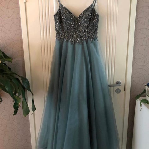 Turkoosi vanhojentanssimekko, M koko. Mekkoa on lyhennetty hieman, sopii n. 170 cm pitkälle.