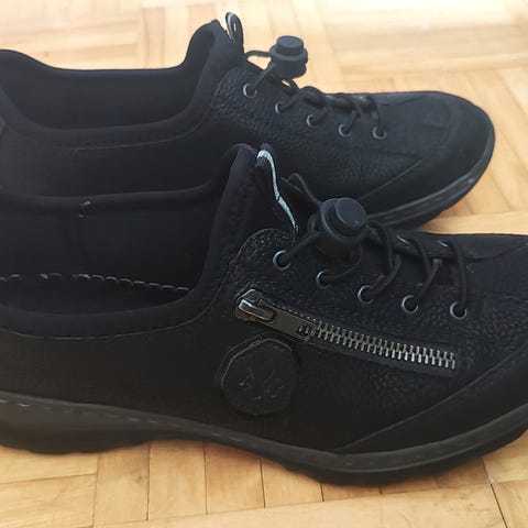 Siistikuntoiset, niin tummansiniset kiilapohjaiset Rieker tennarit, että näyttävät lähestulkoon mustilta. Valkoinen ulkopohja ja aksenttivärinä hopeaa. Nauhat ja pukemista helpottava vetoketju, joka toimii kengässä myös yksityiskohtana.