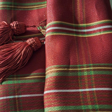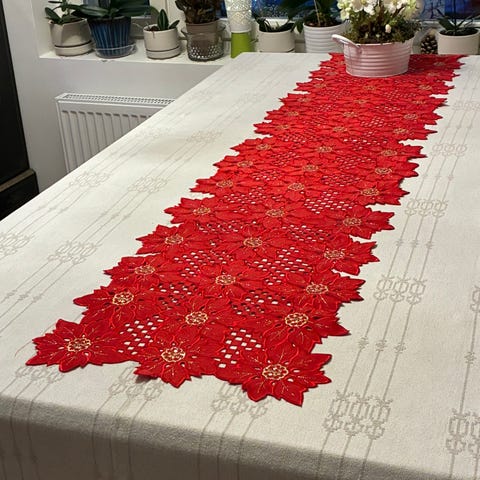 Hyväkuntoinen jouluinen kaitaliina, koko n. 30,5*119,5cm. Kuviot kirjailtu, ei painettu.