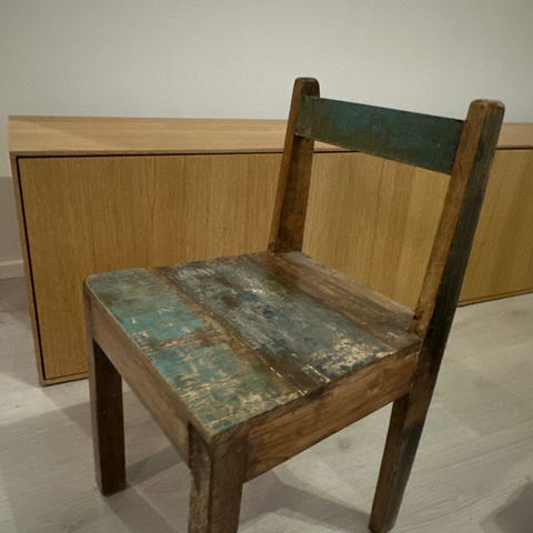 Hyvässä kunnossa vanha lasten tuoli .Selkä nojassa puttu yksi ruuvi.Varmazgi tarvitse hijotta tai ei .Kotimainen leima.Korkeus noin 38 cm.