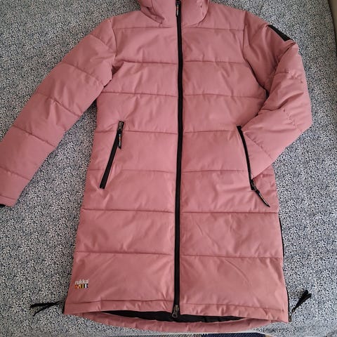 Lämmin Rukka toppatakki pinkki-valkoinen. Koko S pituus olka-helma 70cm. Ei ole juurikaan käytetty valkoisetkin osat kirkkaita