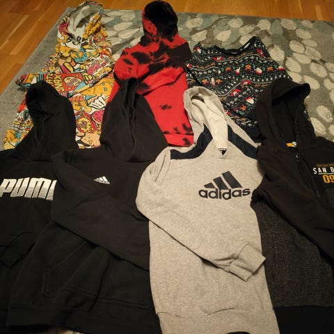 Myynnissä kolme paitaa, kaksi hupparia ja yksi pitkähihainen paita.
