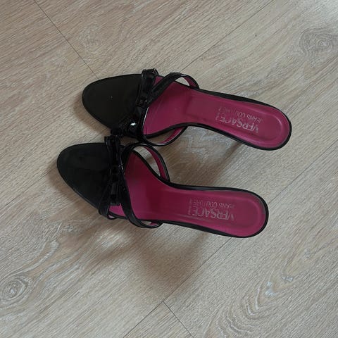 Aidot Versacen kengät. Mustat. Kultaiset yksityiskohdat. Oikein hyvät jalassa. Postitus ok.