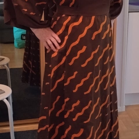 Myydään pääväriltään ruskea mekko kotimaiselta 80-luvulta vaatemerkiltä Elegance by Soili, valmistaja Soilituote Oy Lahti Finland,