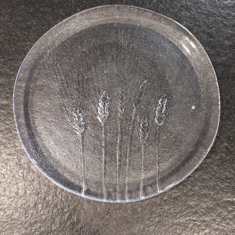 Myydään tällainen hyväkuntoinen Humppilan lasin Suomen lippu -tarralla varustettu lasilautanen. Tämä lautanen on käsintehty Suomessa ja tässä on kotoisia maalaistunnelmaisia viljakuvioita. Reuna on aaltoilevaa lasia ja viljakuviot ovat hieman koholla; kiva hivellä sormella sileää kohoilevaa pintaa 🤩 Halkaisija on noin 24cm. Mielestäni tämä on sen kokoinen, että tältä on mukava tarjoilla vaikka keksejä (sopii kuin nakutettu mummolahenkiseen kahvipöytään keksien alle), mutta myös hyvä koko pienelle salaattiluonaalle tms. jos haluaa syödä nätiltä ja raikkaalta lautaselta.