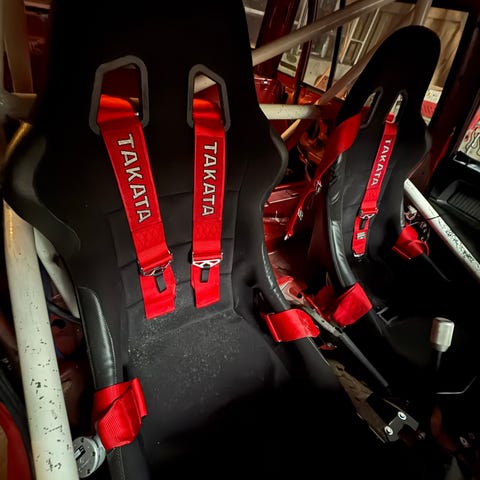 Vihree/musta kangas, jollei kuvistä näy... KIskoineen ja turvavyön lukot kiristimet paikoillaan. Alaosan liitintä ei ole runnottu, vaan katkoin pätkän johtosarjaa mukaan.