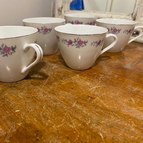 2 kpl teekuppeja (leveys 10,5 cm, korkeus 5,5 cm), aluslautasia (13,7 cm) ja tasseja (15 cm).