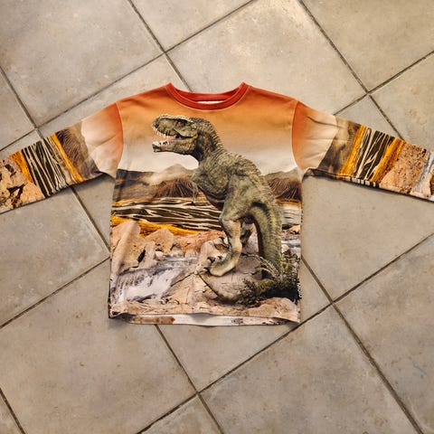 Molo dinosauruspaita koko 122. Yhden pojan jäljiltä, mutta vaatepaljoudessa ei ihan hirveästi ole ehtinyt käyttökertoja tulla. Hyväkuntoinen toisellekin.